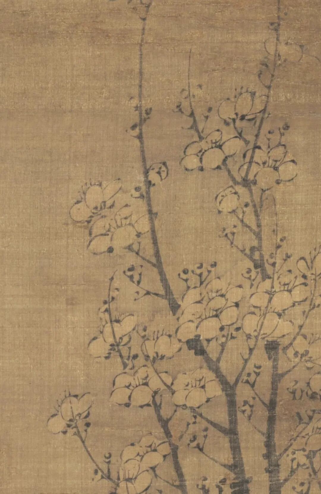 画面里,一枝梅花从一侧横斜而出,直冲云表,那枝干,强盛得像老农的手,豪迈却有劲。梅花呢,疏密有致,有的绽放得激烈,有的还黄金时代,像是在蟾光下玩起了“躲猫猫”。