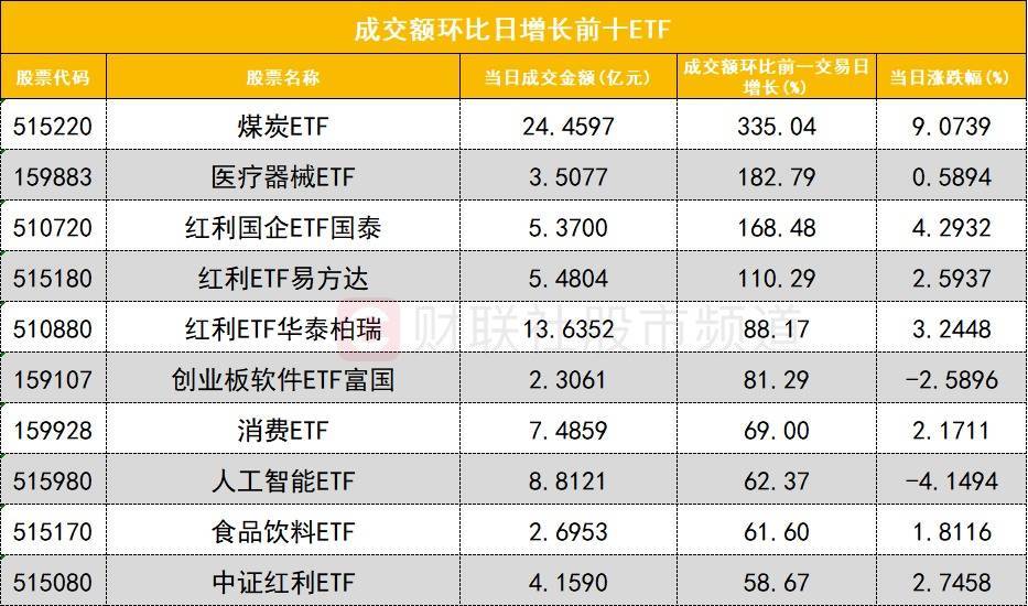 从成交额环比增长前十的ETF来看,煤炭ETF(515220)成交额环比增长335%位居首位;医疗器械ETF(159883)成交额环比增长182%位居次席。