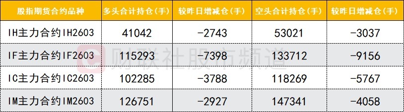 四大期指主力合约中,IH、IF、IC、IM合约多空两边均减仓,且空头减仓数目较多。