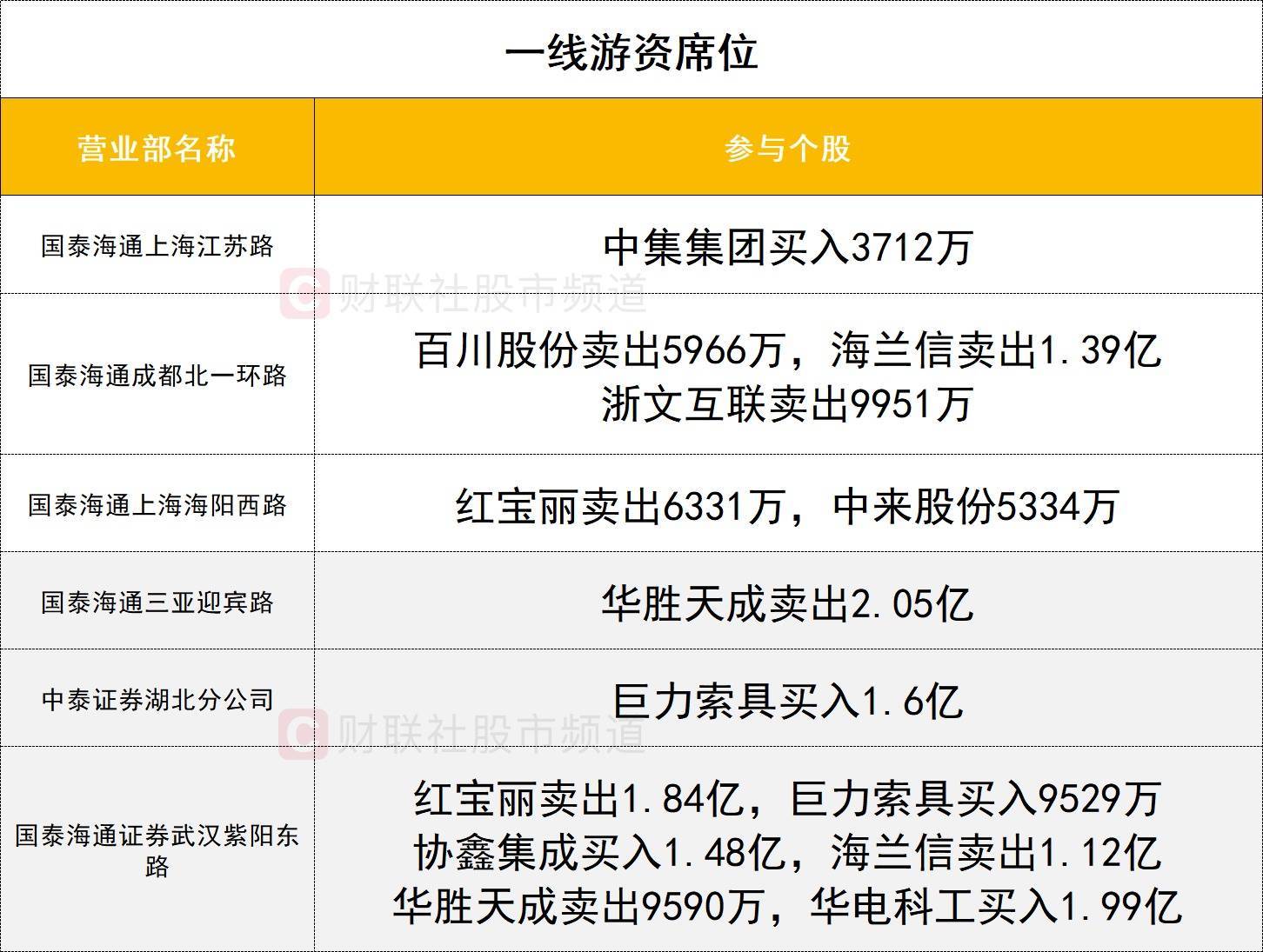一线游资活跃度一般,生意航天倡导股海兰信盘中冲高回落,两家游资(国泰海通证券成齐北一环路、国泰海通证券武汉紫阳东路)隔离卖出1.39亿、1.12亿。红宝丽获两家一线游资(国泰海通证券武汉紫阳东路、国泰海通证券上海海阳西路)系数卖出2.47亿。