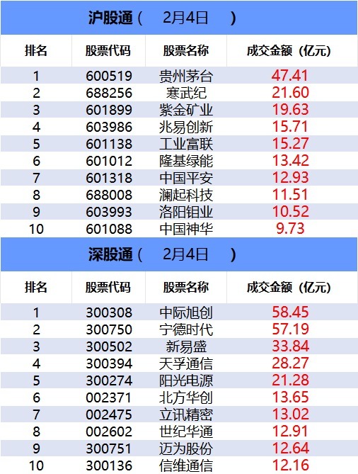从沪股通前十大成交个股来看,贵州茅台位居首位;寒武纪和紫金矿业分居二、三位。