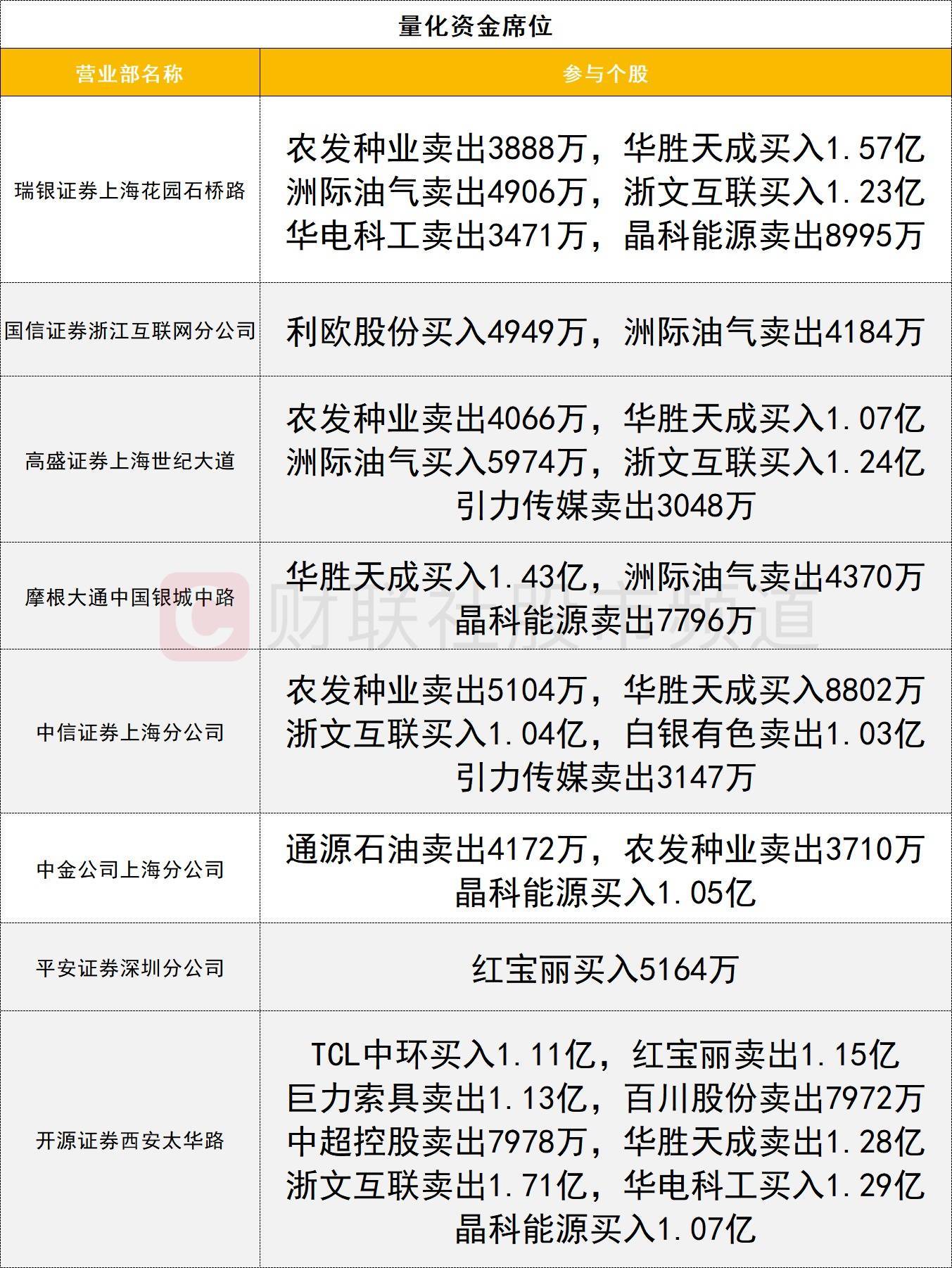 量化资金活跃度较高,红宝丽遭一家量化资金(开源证券西安太华路)卖出1.15亿。量化资金热烈博弈晶科动力,两家量化资金(开源证券西安太华路、中金公司上海分公司)隔离买入1.07亿、1.05亿,同期遭两家量化资金(瑞银证券上海花坛石桥路、摩根大通中国银城中路)隔离卖出0.89亿、0.77亿。
