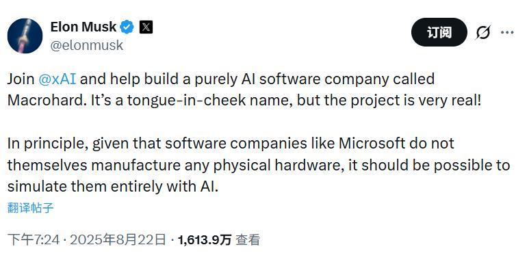 算作布景,马斯克旧年8月首度公洞开告“巨硬”(Macrohard)技俩,公开叫板软件巨头微软(Microsoft)。