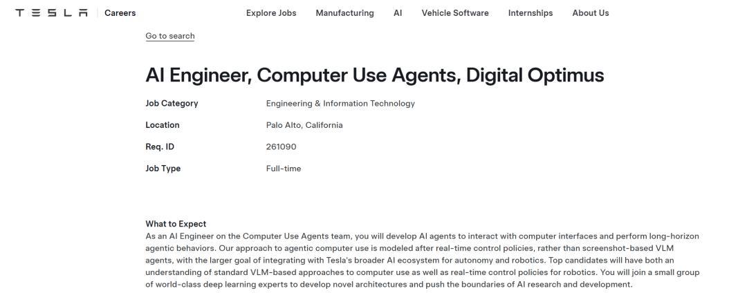 特斯拉的招聘网页也露馅,本年2月出现了一个AI工程师的岗亭,中枢岗亭描摹便是开导“能使用电脑的AI代理”——巧合履行“自主软件交互、代码生成和及时有规画”等任务。
