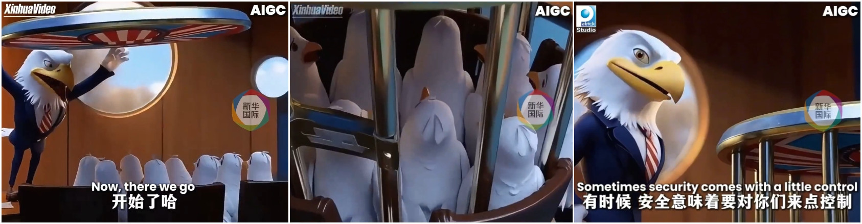 不久后,新华社在国外应酬平台发布“白头鹰”系列AI动画的新一集:标志好意思国的白头鹰按下红色按钮激发爆炸,引得“白鸽们”记挂万分;白头鹰当场举起盾牌,宣称“由我来保险全球的安全”。待不解就里的白鸽聚积过来,盾牌片刻化作樊笼将它们困住,而始作俑者奸诈一笑,“随机候,安全意味着要对你们来点戒指。”