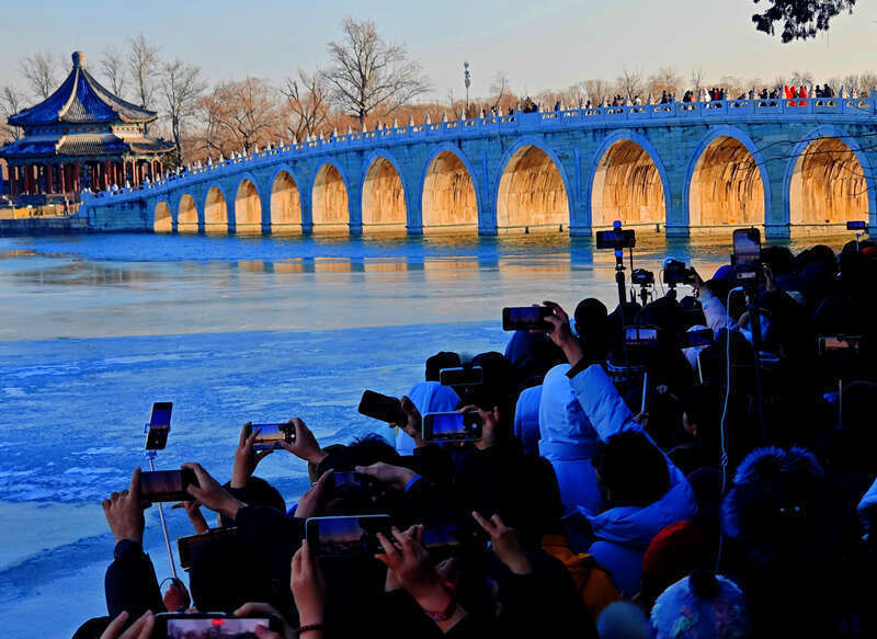 12月21日,北京,冬至时节,颐和园十七孔桥再现“金光穿洞”局势,勾引巨额游客不雅赏。位于北京颐和园内昆明湖水域的十七孔桥,因由17个桥洞构成而得名。每年冬至前后,日落时候,这里齐会迎来“金光穿洞”景不雅。视觉中国供图