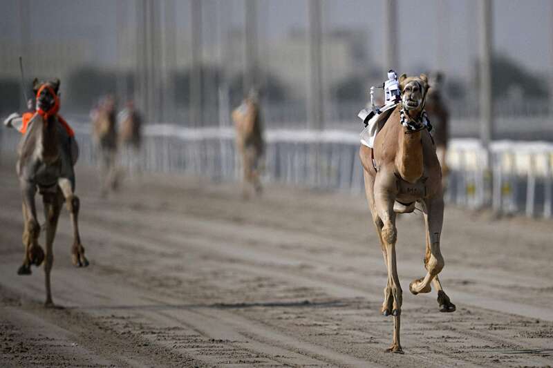 当地时间12月25日,卡塔尔沙哈尼亚,一个身着彩色跑马服的遥控机器东说念主骑师在沙地赛说念上参加骆驼比赛。骆驼由操作员通过鞭子天线、缰绳领导和内置扬声器发出饱读舞声来带领。视觉中国供图