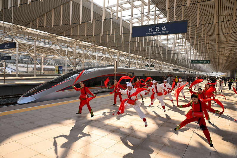 12月26日,西延高铁通达运营首日,延安火车站内,身着传统衣饰的大家鸾歌凤舞强烈迎接乘坐从西安朔标的开过来的C9312次报恩号智能动车组的首批搭客。算作陕北立异老区首条高铁,西延高铁的通达让延安融入关中地区“一小时通勤圈”,也象征我国高铁运营里程打破5万公里。视觉中国供图